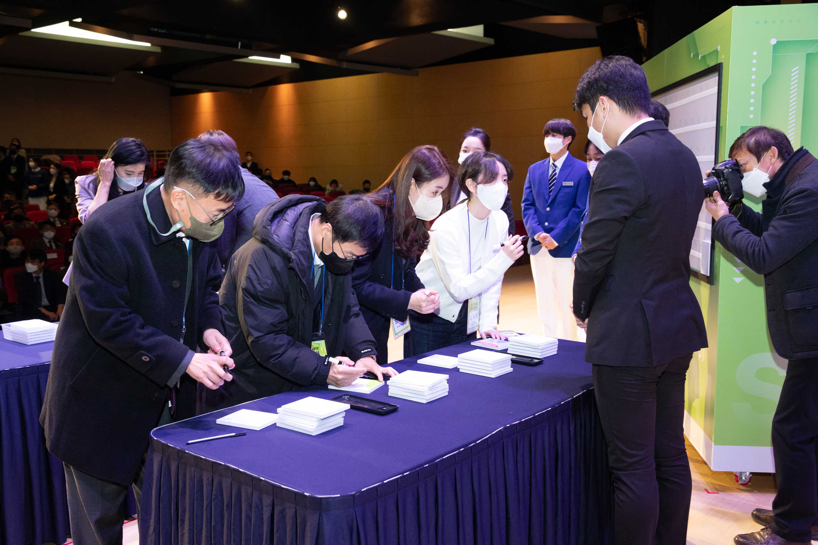 캠프 운영기관으로 선정된 59개 대학교와 16개 기업, 17개 시·도교육청의 관계자분들, 조율래 한국과학창의재단 이사장님과 전진석 충남교육청 부교육감님, 그리고 이주호 사회부총리 겸 교육부장관님이 각자 서명을 한 팻말을 모아 ‘디지털새싹’이라는 통합 BI를 완성한 것으로, 참석자 전원이 함께 참여하여 디지털 대전환 시대를 선도해 나갈 ‘디지털 새싹’을 키운다는 의미 깊은 퍼포먼스였습니다.
