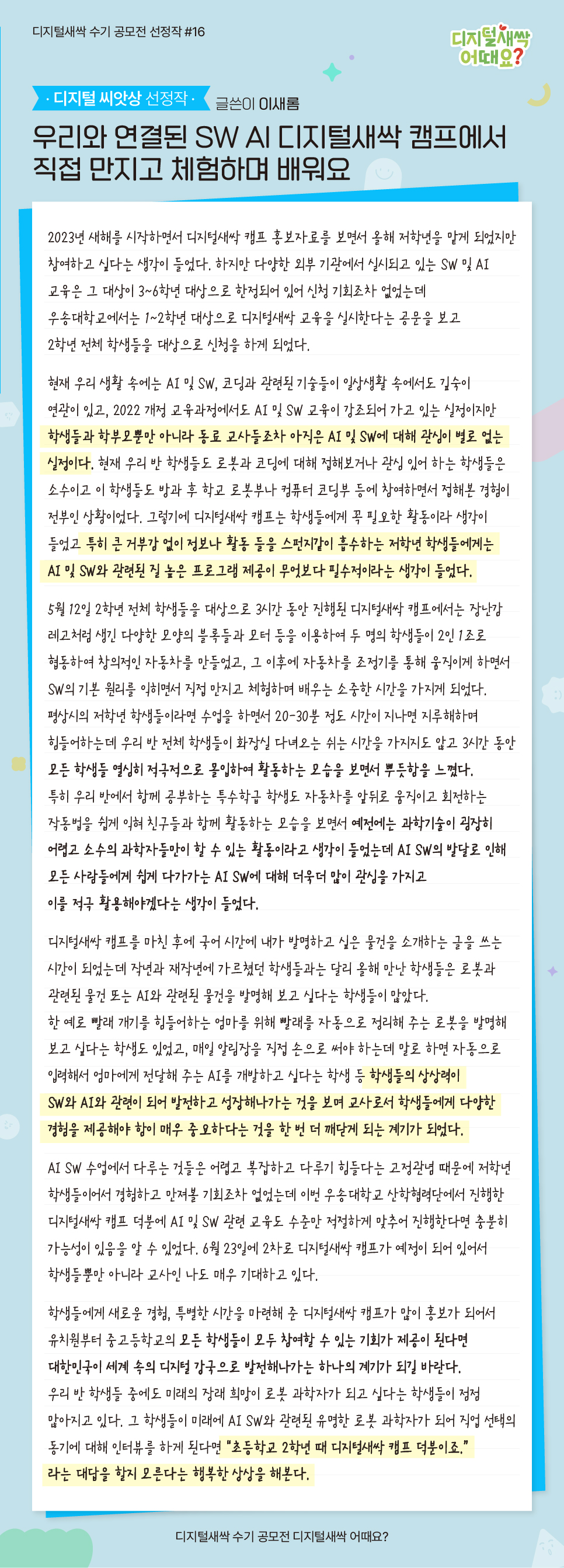 오늘도 지난봄, 디지털새싹 캠프 참여 소감을 주제로 한 디지털새싹 수기공모전 ‘디지털새싹 어때요?’ 수상작을 소개해드리려 합니다. 디지털씨앗상 수상작 이새롬님의 작품 ‘우리와 연결된 SW AI 디지털새싹 캠프에서 직접 만지고 체험하며 배워요’ 함께 만나 볼까요?