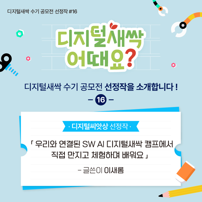 오늘도 지난봄, 디지털새싹 캠프 참여 소감을 주제로 한 디지털새싹 수기공모전 ‘디지털새싹 어때요?’ 수상작을 소개해드리려 합니다. 디지털씨앗상 수상작 이새롬님의 작품 ‘우리와 연결된 SW AI 디지털새싹 캠프에서 직접 만지고 체험하며 배워요’ 함께 만나 볼까요?