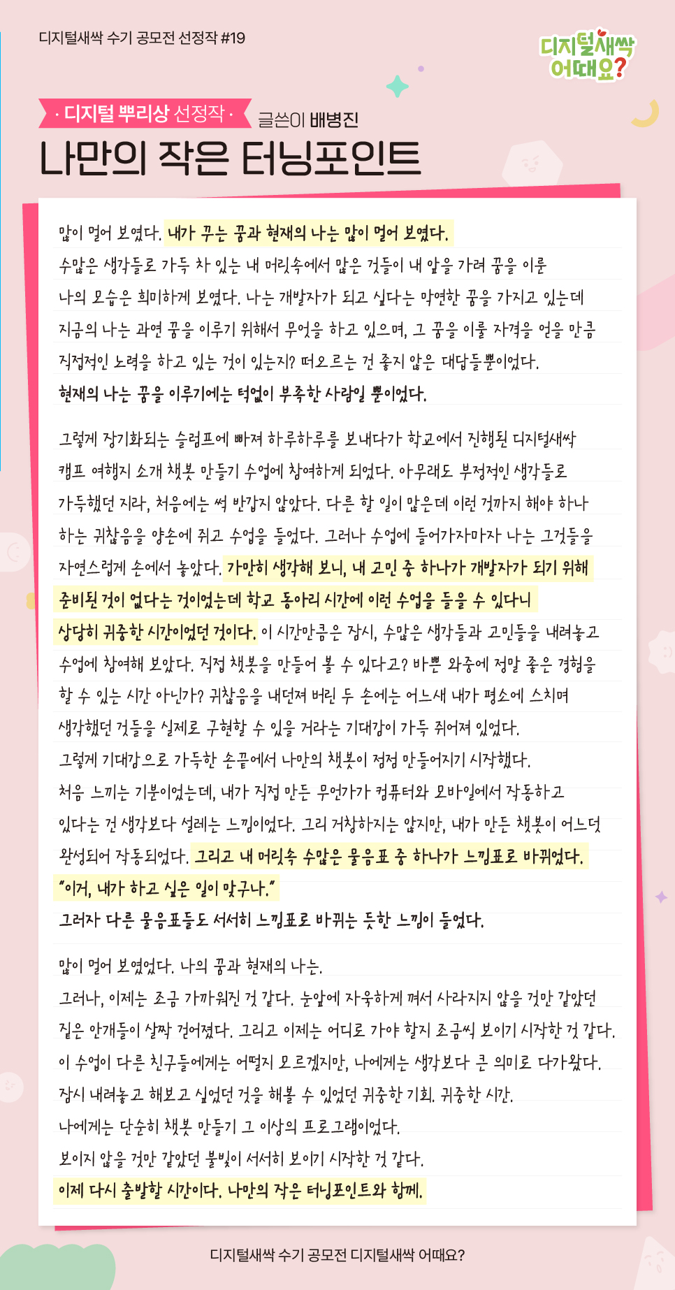 오늘도 지난봄, 디지털새싹 캠프 참여 소감을 주제로 한 디지털새싹 수기공모전 ‘디지털새싹 어때요?’ 수상작을 소개해드리려 합니다. 디지털뿌리상 수상작 배병진님의 작품 ‘나만의 작은 터닝포인트’ 함께 만나 볼까요?