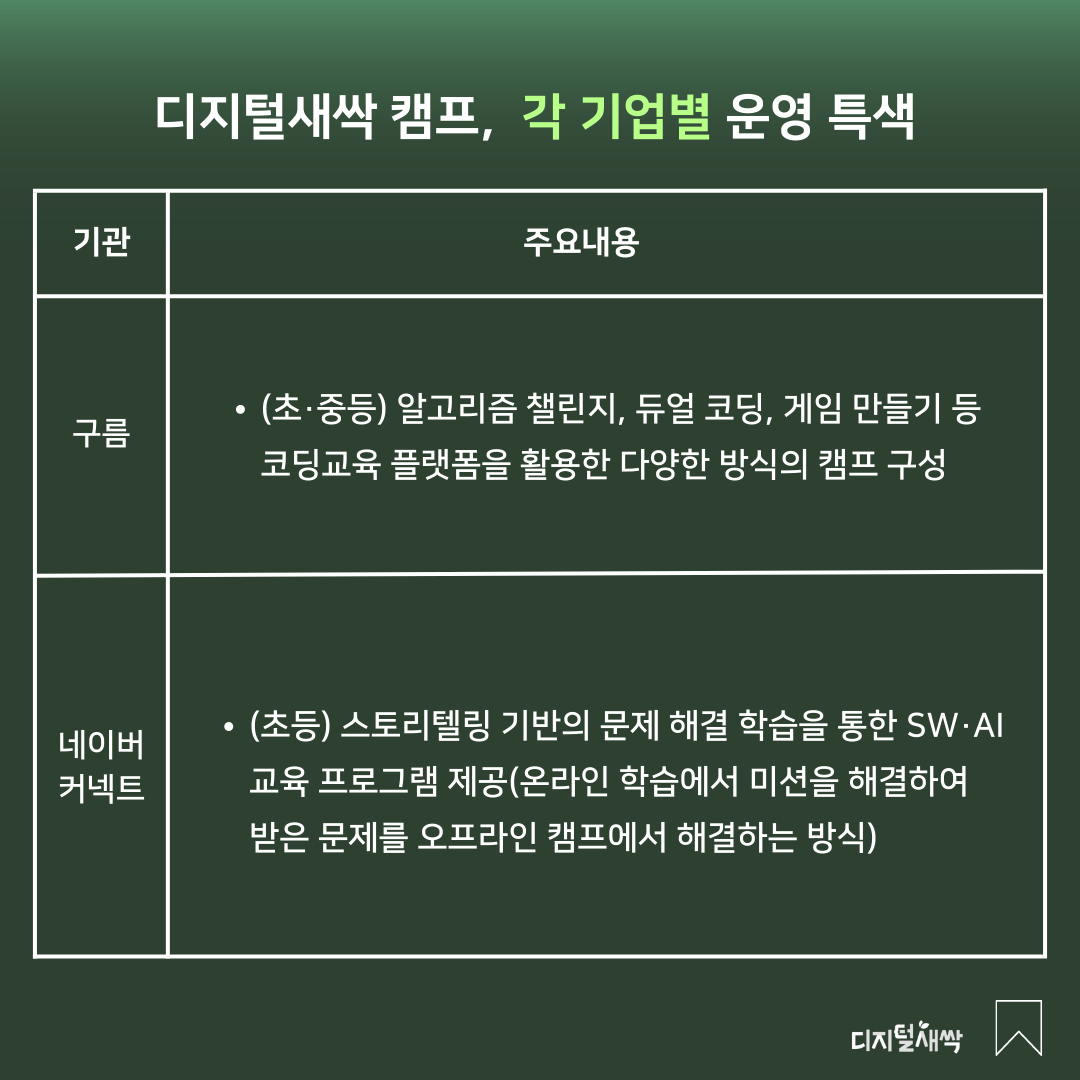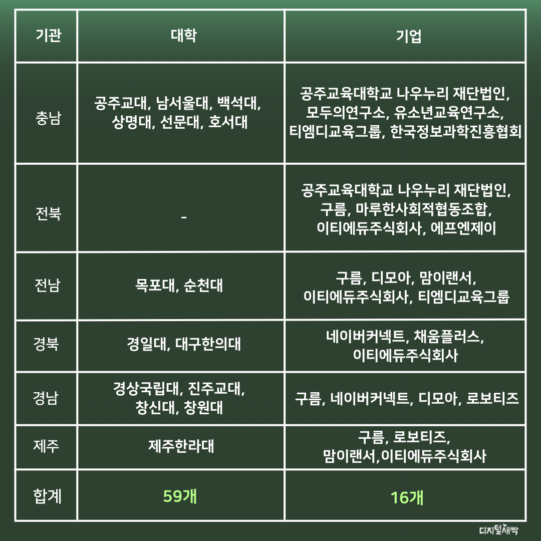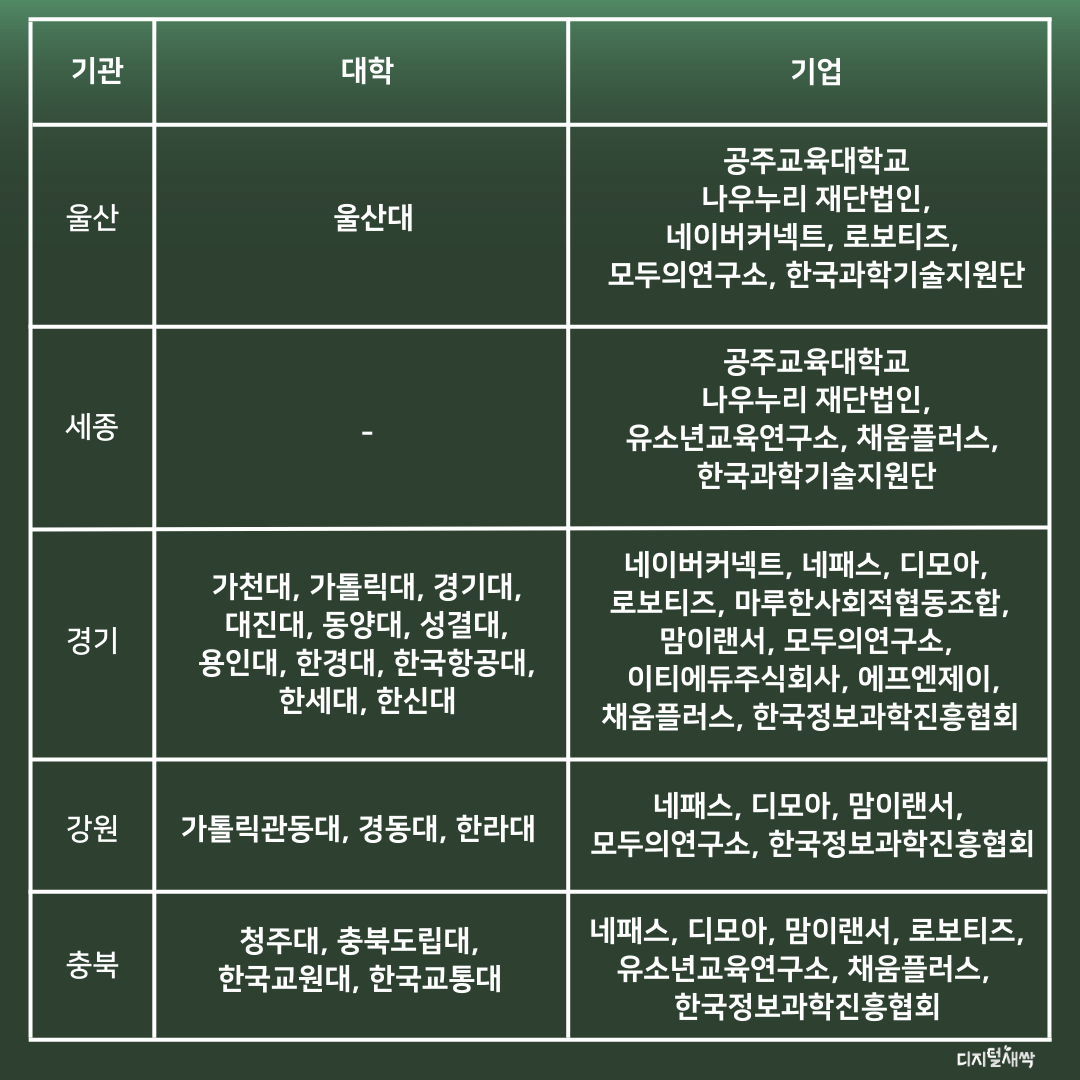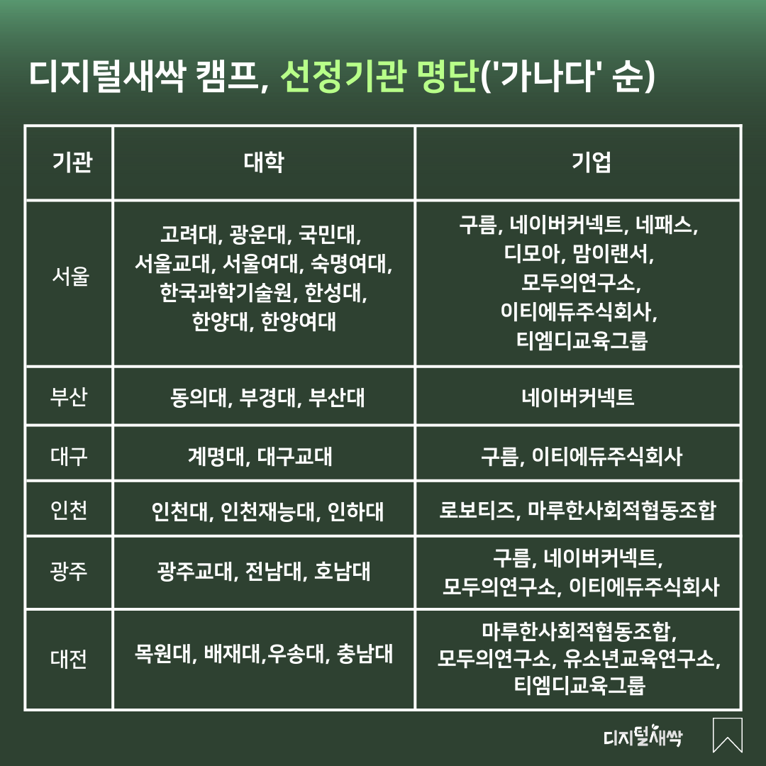 그렇다면 구체적으로 어떤 대학과 기업이 디지털새싹 캠프 운영 기관으로 선정되었는지 알아볼까요?
