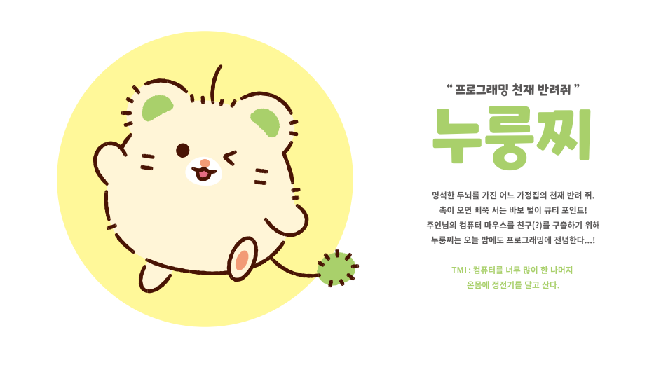 디지털새싹 대표캐릭터로, 마우스(Mouse)의 중의적 의미를 활용하여 '마우스를 누르다 + 쥐' = 누룽찌가 탄생하게 되었습니다!
