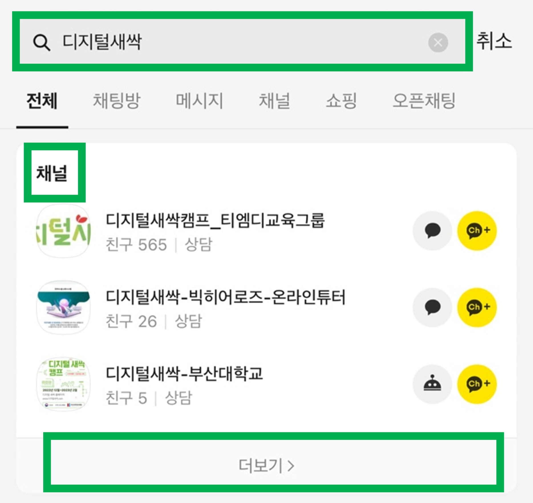 2. <디지털새싹> 검색 후 채널에서 더보기를 눌러주세요.