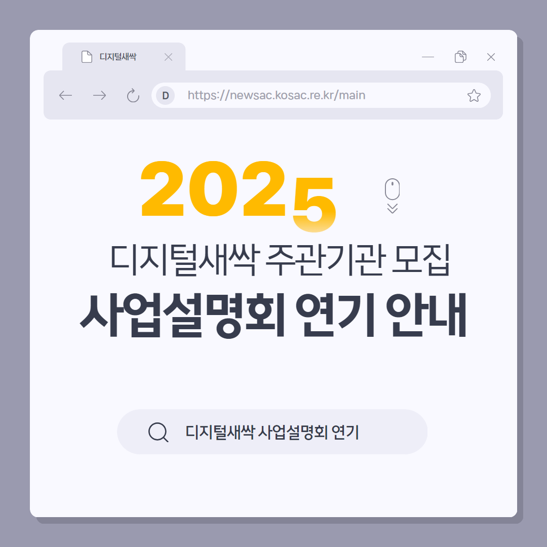 2025년 1월 23일(목)에 예정되었던 '디지털새싹 사업 주관기관 모집 설명회'가 내부 사정으로 인해 연기(3월 중 개최 예정)되었음을 알려드립니다. 변경된 설명회 일정은 추후 확정되는 대로 재공지할 예정이며, 설명회를 기다려 주신 관계자 여러분들께 불편을 끼치게 된 점 진심으로 사과드립니다.