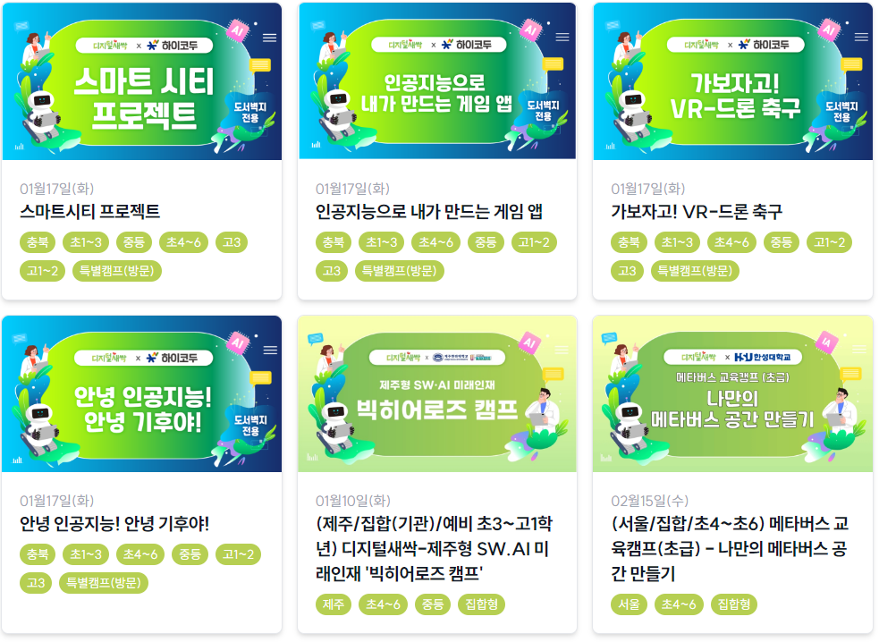 교육부와 17개 시 · 도교육청 및 한국과학창의재단은 전국적으로 디지털새싹 캠프를 운영하여 방학기간 동안 청소년들이 소프트웨어와 인공지능에 흥미를 느끼고 체험과 교육을 받을 수 있게 하였습니다.