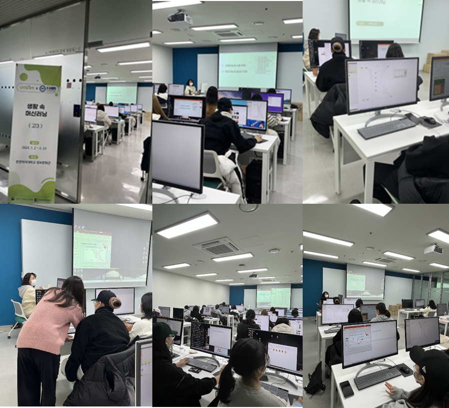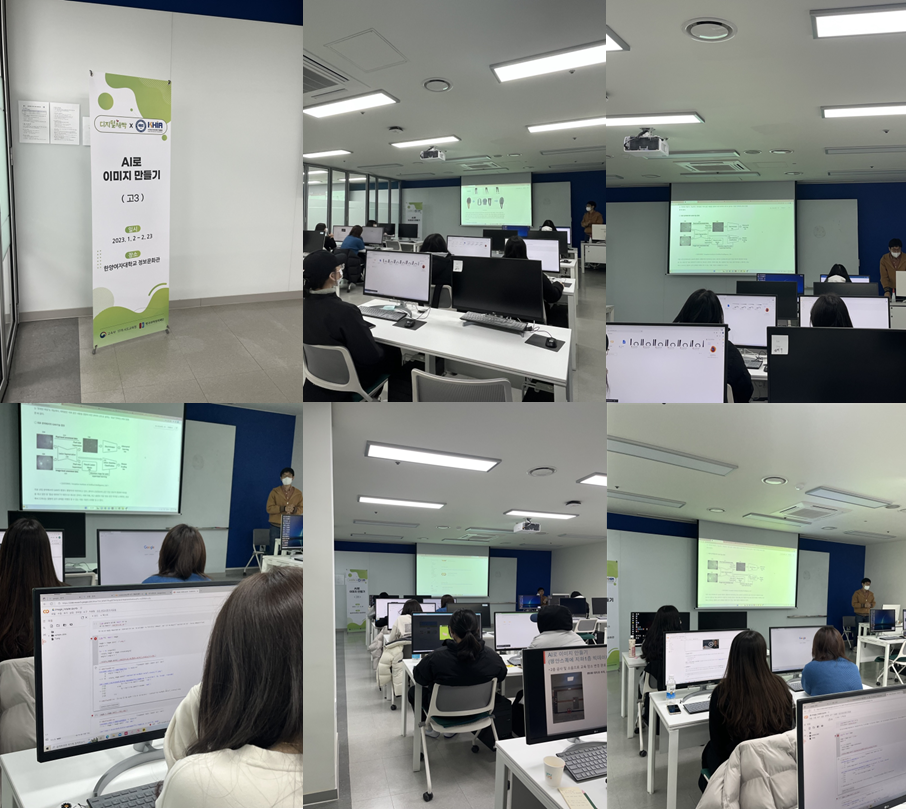 2023년 1월 12일 목요일에 ‘AI로 이미지 만들기’, ‘직업 속 머신러닝’, ‘생활 속 머신러닝’ 총 3개의 수업을 진행하였습니다. 이번 캠프 수업은 고등학생 3학년 학생들을 대상으로 한양여자대학교에서 이루어졌어요!