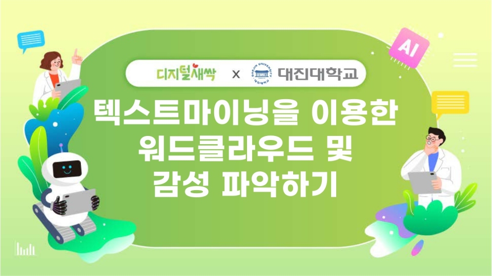 대진대학교에서 운영하는 ‘텍스트마이닝을 이용한 워드클라우드 및 감성 파악하기’ 캠프는 텍스트마이닝 기술을 활용하여 대량의 문서를 분석하는 기술 학습, 텍스트 마이닝 알고리즘 적용 방법을 탐구하고 챗봇을 생성해보는 캠프입니다. 파이썬과 AI기술을 활용하여 데이터를 분석하는 활동을 할 수 있다고 하네요.