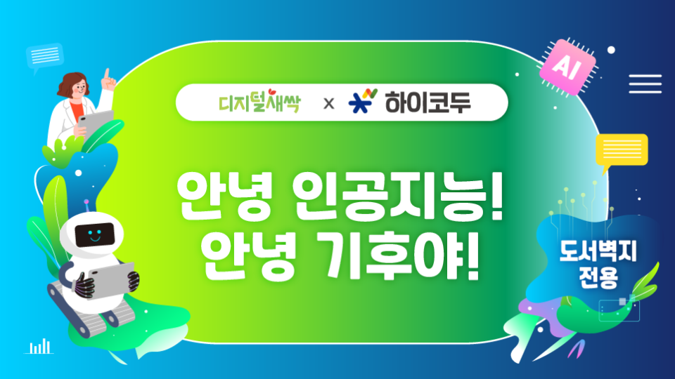 하이코두에서 운영하는 ’ 안녕 인공지능! 안녕 기후야!‘ 캠프는 기후문제를 해결하기 위한 인공지능 로봇을 만들고 다양한 활용방안을 알아보는 캠프입니다. 학생들은 직접 기후문제 해결 아이디어를 제시하고 우리 마을의 기후문제 해결을 위한 인공지능 작품을 제작할 수 있습니다. 자세한 내용은 링크를 클릭하고 확인하세요.