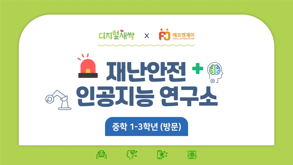 에프앤제이에서 운영하는 ‘재난안전 인공지능 연구소’ 캠프는 교과 과정과 연계해 사회문제 발굴부터 해결까지 인공지능 로봇팔, 자율주행차, 센싱 기술 등을 융복합적으로 활용하는 PBL 형식의 캠프입니다. 드론과 인공지능 교구재 등을 복합적으로 활용하여 스마트 재난 대응 프로그램을 구현해보는 활동을 합니다.