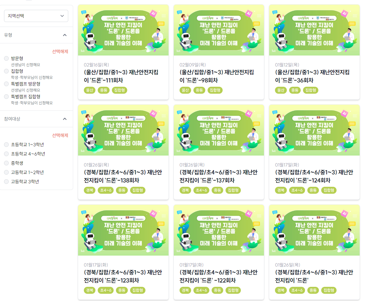 경일대학교에서 운영하는 ‘재난안전지킴이 드론’ 캠프는 미래 핵심 과학 기술인 드론과 재난 대응 교육을 결합하여 학생들이 실생활에서 접하는 다양한 문제 상황을 프로그래밍을 통해 해결해 보는 캠프입니다. 드론의 개념과 재해재난 구조용 드론의 역할을 학습할 수 있습니다.