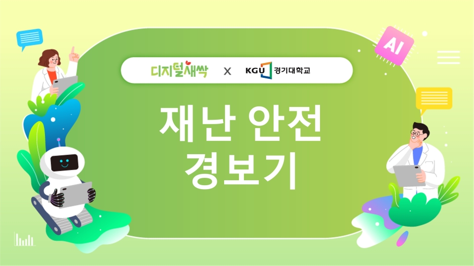 재난으로부터의 안전을 보장하는 분야에도 소프트웨어와 인공지능 기술이 꼭 필요합니다. 지금부터 재난 발생 시 가장 빠르게 주변 사람들에게 상황을 전파할 수 있는 경보 시스템부터 드론과 인공지능 기술을 이용하여 재난 상황에 대응하는 시스템까지 학습하고 경험할 수 있는 디지털새싹 캠프 3가지를 소개합니다.