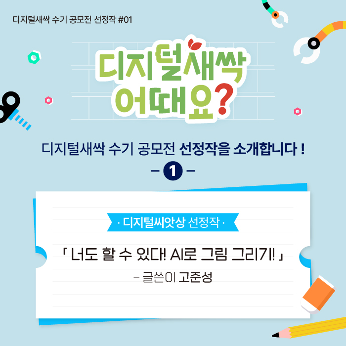 안녕하세요. 디지털새싹입니다. 지난봄, 디지털새싹 캠프 참여 소감을 주제로 한 디지털새싹 수기공모전 ‘디지털새싹 어때요?’가 개최되었습니다. 많은 분들이 디지털새싹에서의 즐거운 경험을 보내주셨습니다. 오늘은 수기공모전에서 수상한 작품을 소개해드리려 합니다. 디지털씨앗상 수상작 고준성 님의 작품 ‘너도 할 수 있다! AI로 그림 그리기!’ 함께 만나 볼까요?