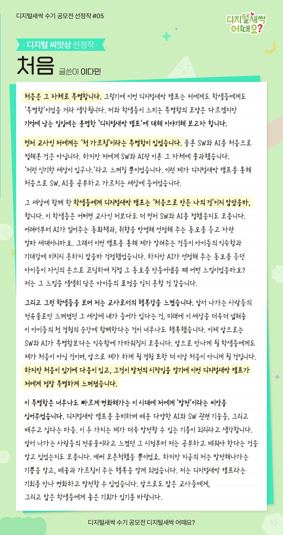 지금까지 이다민님의 작품이었습니다. 디지털새싹 캠프를 통해 처음으로 SW, AI를 공부하고 가르치는 세상에 들어서게 되며 느낀 행복이 전해지는데요.