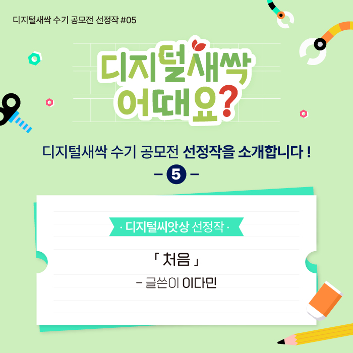오늘도 지난봄, 디지털새싹 캠프 참여 소감을 주제로 한 디지털새싹 수기공모전 ‘디지털새싹 어때요?’ 수상작을 소개해드리려 합니다. 디지털씨앗상 수상작 이다민님의 작품 ‘처음.’ 함께 만나 볼까요?