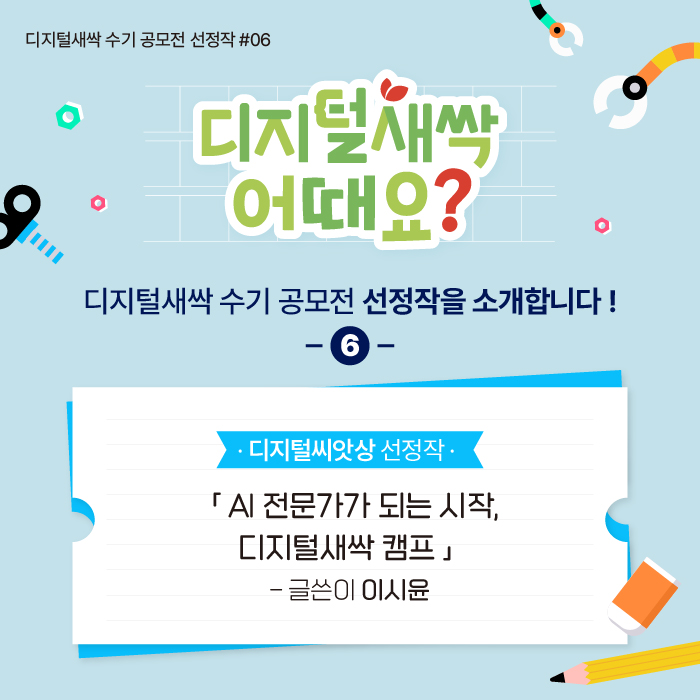 오늘도 지난봄, 디지털새싹 캠프 참여 소감을 주제로 한 디지털새싹 수기공모전 ‘디지털새싹 어때요?’ 수상작을 소개해드리려 합니다. 디지털씨앗상 수상작 이시윤님의 작품 ‘AI 전문가가 되는 시작, 디지털새싹 캠프’ 함께 만나 볼까요?