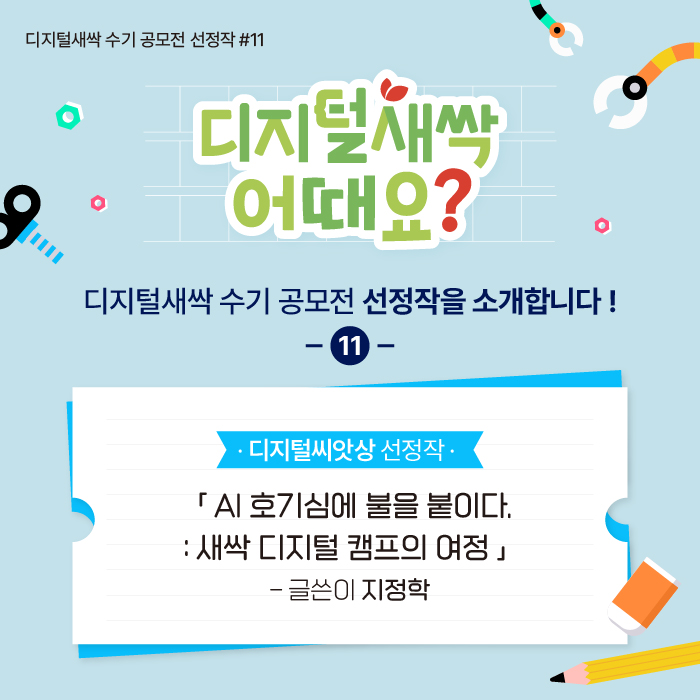 오늘도 지난봄, 디지털새싹 캠프 참여 소감을 주제로 한 디지털새싹 수기공모전 ‘디지털새싹 어때요?’ 수상작을 소개해드리려 합니다. 디지털씨앗상 수상작 지정학님의 작품 ‘AI 호기심에 불을 붙이다. : 새싹 디지털 캠프의 여정’ 함께 만나 볼까요?