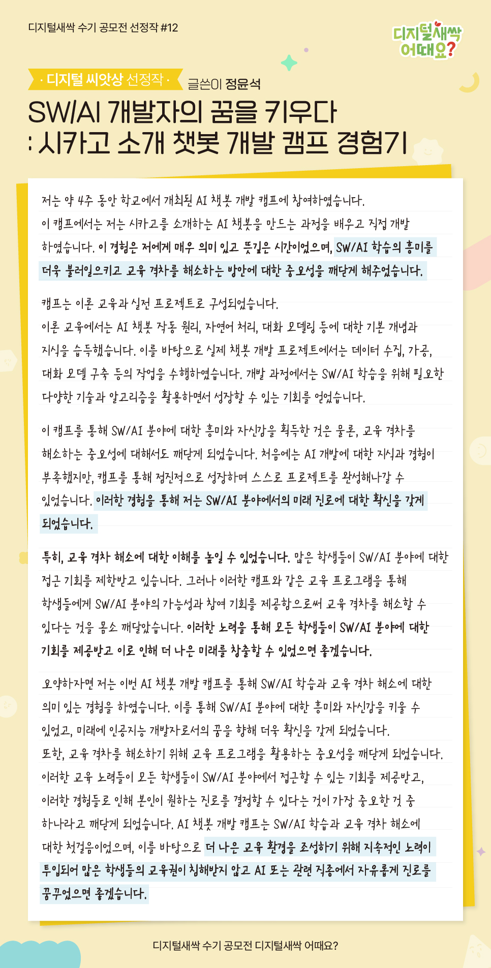 오늘도 지난봄, 디지털새싹 캠프 참여 소감을 주제로 한 디지털새싹 수기공모전 ‘디지털새싹 어때요?’ 수상작을 소개해드리려 합니다. 디지털씨앗상 수상작 정윤석님의 작품 ‘SW/AI 개발자의 꿈을 키우다: 시카고 소개 챗봇 개발 캠프 경험기’ 함께 만나 볼까요?