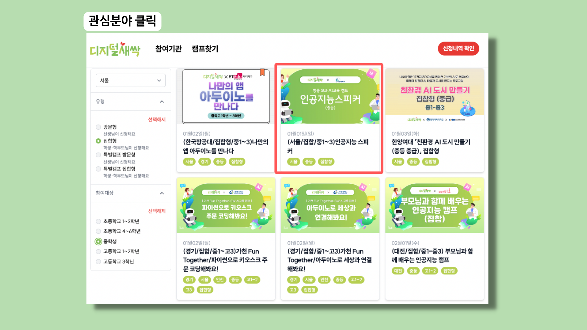 5) [캠프선택] 아래로 화면을 내리면서 평소 관심 있었던 분야나 관심 있는 주제의 캠프를 찾아 선택합니다.