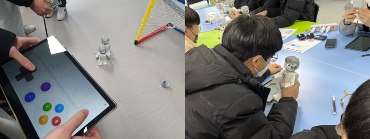 휴머노이드 로봇이란, 인간의 신체와 유사한 모습을 한 로봇입니다. 귀엽게 생긴 로봇 덕분인지 학생들도 적극적으로 수업에 임하였고 강사님께서도 학생들에게 많이 도움을 주셨답니다. 학생들은 로봇에게 명령을 내리고, 로봇을 조종하여 축구를 하였습니다. 골을 넣고 세레머니를 하는 로봇에 모두가 빵 터지기도 하였어요~ (´∀`)