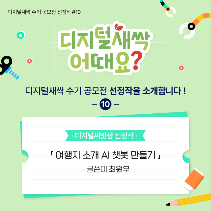 오늘도 지난봄, 디지털새싹 캠프 참여 소감을 주제로 한 디지털새싹 수기공모전 ‘디지털새싹 어때요?’ 수상작을 소개해드리려 합니다. 디지털씨앗상 수상작 최원우님의 작품 ‘여행지 소개 AI 챗봇 만들기’ 함께 만나 볼까요?