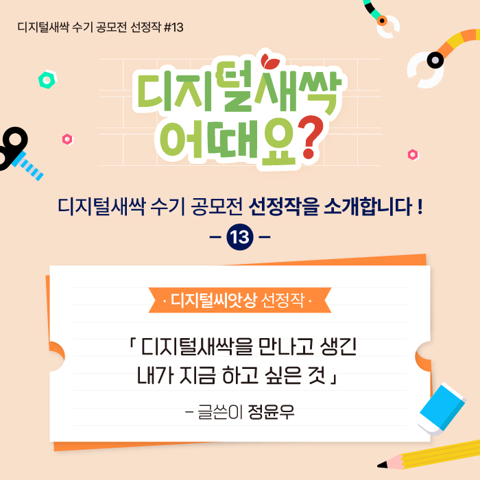 오늘도 지난봄, 디지털새싹 캠프 참여 소감을 주제로 한 디지털새싹 수기공모전 ‘디지털새싹 어때요?’ 수상작을 소개해드리려 합니다. 디지털씨앗상 수상작 정윤우님의 작품 ‘디지털새싹을 만나고 생긴 내가 지금 하고 싶은 것 ’ 함께 만나 볼까요?