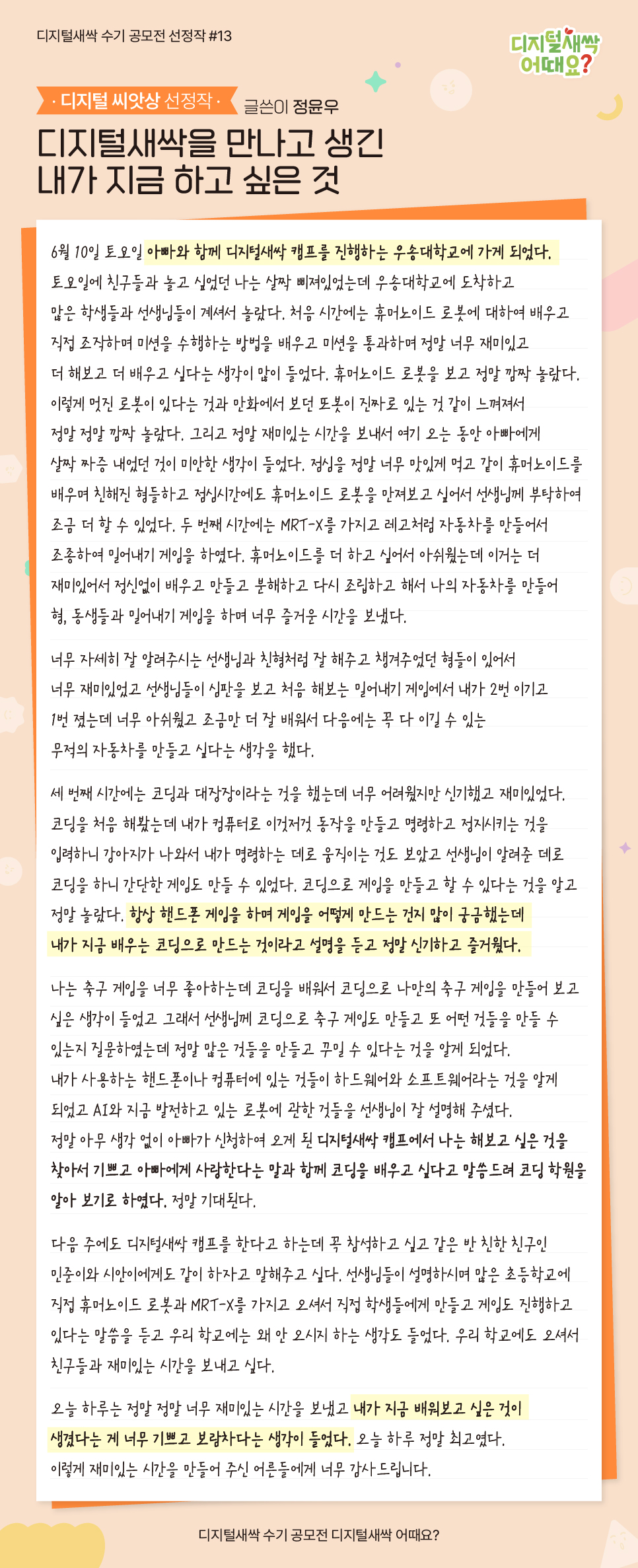 지금까지 정윤우님의 작품이었습니다. 친구들과 놀고 싶은 마음에 디지털새싹 캠프에 참여하기를 망설였지만, 캠프가 끝난 후에는 기쁘고 보람찼다는 이야기가 보는 이들에 웃음을 짓게 합니다.
